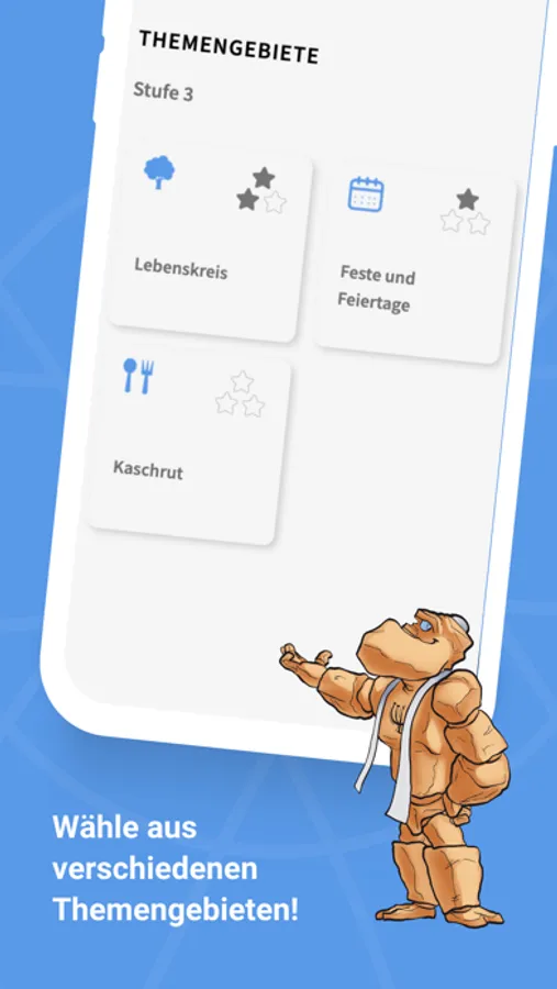 Das Wissen um das jüdische Leben lebendig verständlich gemacht - ein Quiz für Kinder, Jugendliche und wissensbegeisterte Erwachsene. Die Auswahl unterschiedlicher Altersklassen ermöglicht differenzierte Zugänge und Schwierigkeitsgrade. Im Distance Learning führt der Grazer Golem durch die einzelnen Lerneinheiten und motiviert zum Eintauchen in die jüdische Kultur. Die App kann einfach von zu Hause aus gespielt und auch für das Distance Learning eingesetzt werden. Von Alltagsgegenständen bis zu religiösen Feiertagen, von jüdischen Friedhöfen bis hin zu historischen Denkmälern lässt sich die jüdische Kultur erkunden. Als Abschluss siehst du deine Erfolge auf einem Zertifikat, das sich mit Lehrer*innen und Freund*innen teilen lässt.