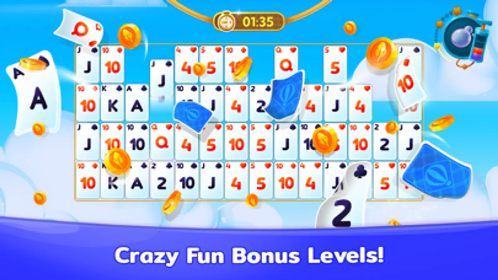 - Use powerful Power-ups like slingshots and boomerangs to pass even the most challenging solitaire levels.