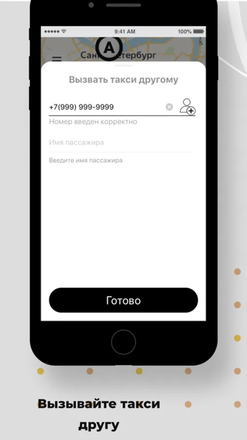 Используйте опцию “Вызвать такси другому” в разделе “Пожелания” и укажите его номер телефона. Когда такси подъедет, на указанный номер придет СМС, а вам — сообщение в приложении.
