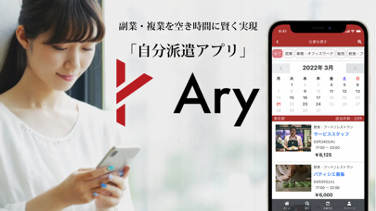Aryでは、空き時間にあなたにあった仕事を選び、現地で仕事をするだけ。職場や自宅の近くの仕事も検索可能。本業があっても、1日数時間のスキマ時間に、単発で副業・複業ができます。