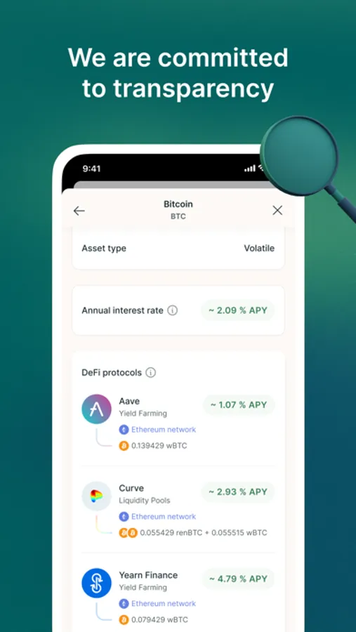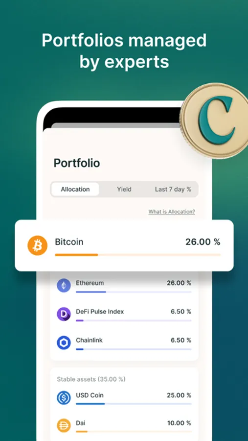 As part of our portfolios, we select volatile and stable assets based on extensive due-diligence. We don't invest in anything that seems too good to be true. Whether you are a conservative or an aggressive investor, our portfolios will suit your needs. Our conservative portfolio, for example, consists of 90% stable coins, while offering 2% to 5% returns and has minimal exposure to volatile coins. We’ve built solutions across DeFi's (Decentralised Finance) ecosystem, which allows our users to earn interest in the same way traditional investing does, but with DeFi, your interest is compounded and you earn round the clock.
