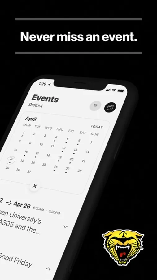 The event section shows a list of events throughout the district. Users can add an event to your calendar to share the event with friends and family with one tap.