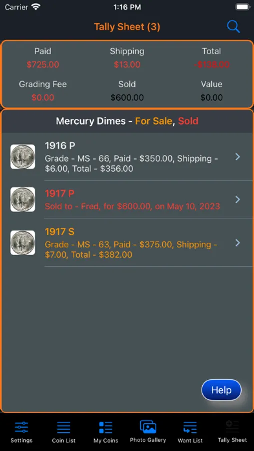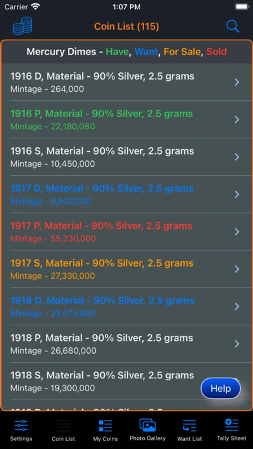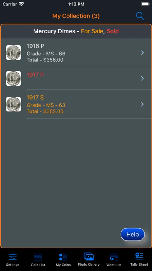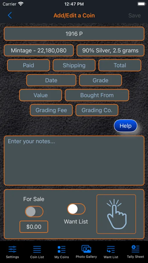 This app will provide the ability for the user to organize, track and manage their collection of coins. Images of each coin can be included with the collection. There is also a means within the app for the user to peruse all of the images in an entertaining manner. The app has three (3) color themes which help to make the app more enjoyable. A running tally of the cost for the entire collection is provided. A want list is also included in the app to allow you to ear-mark coins that you are searching for.