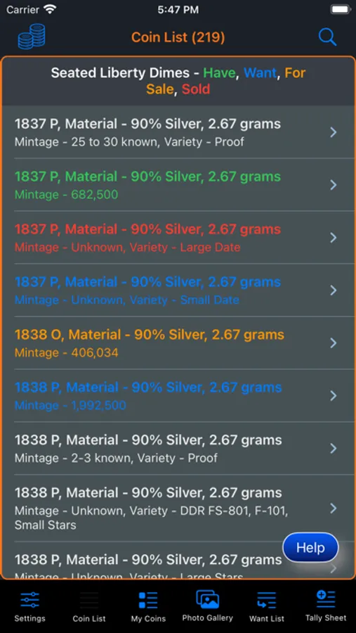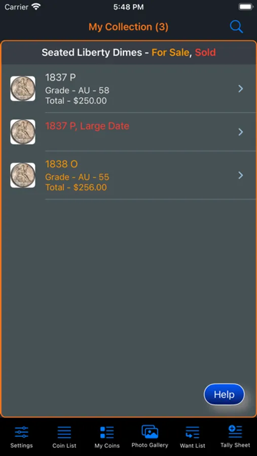 This app will provide the ability for the user to organize, track and manage their collection of coins. Images of each coin can be included with the collection. There is also a means within the app for the user to peruse all of the images in an entertaining manner. The app has three (3) color themes which help to make the app more enjoyable. A running tally of the cost for the entire collection is provided. A want list is also included in the app to allow you to ear-mark coins that you are searching for.