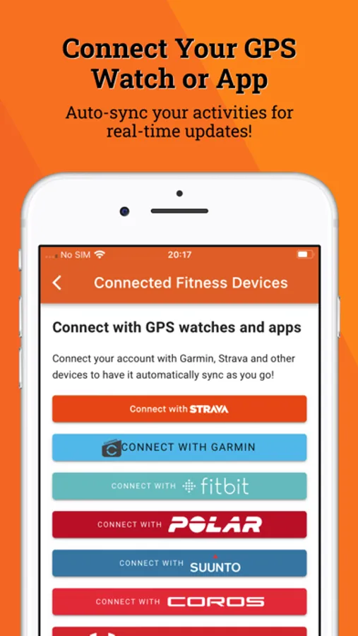 Connect your Garmin, Polar, Suunto, COROS, Fitbit, Strava, MapMyRun, or other GPS app or tracker to automatically sync your activities. Don't have a GPS tracker? No worries! Either use the integrated tracker in our app, or do manual entry.