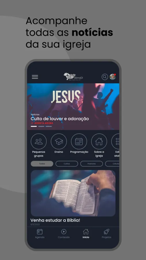 Recursos disponíveis no Aplicativo: Notícias, Agenda da igreja, Eventos, Conteúdos, Projetos, Transmissão ao Vivo e Módulo Ensino.