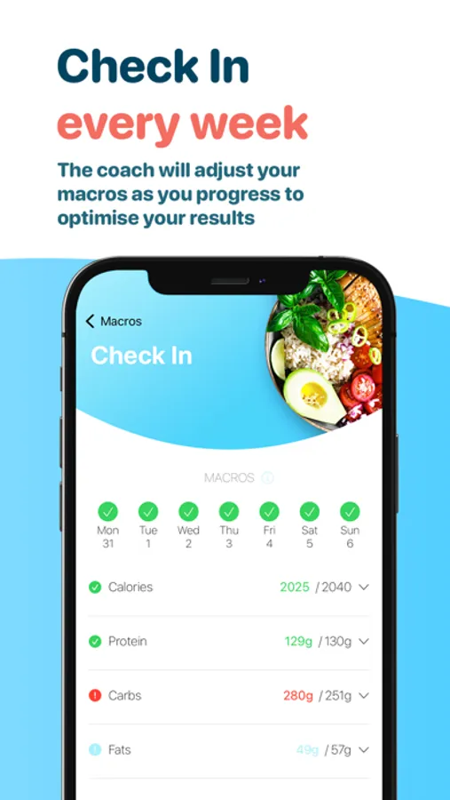 4. Check In each week, and the coach will adjust your macros dynamically as you progress to optimise your results.