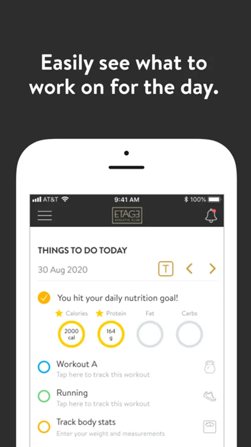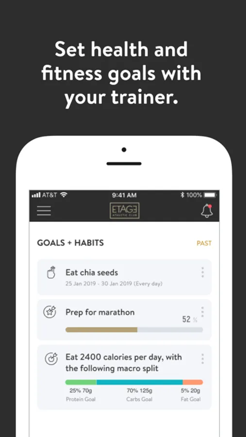 With the Etage Athletic Club App, you can start tracking your workouts and meals, measuring results, and achieving your fitness goals, all with the help of your personal trainer.