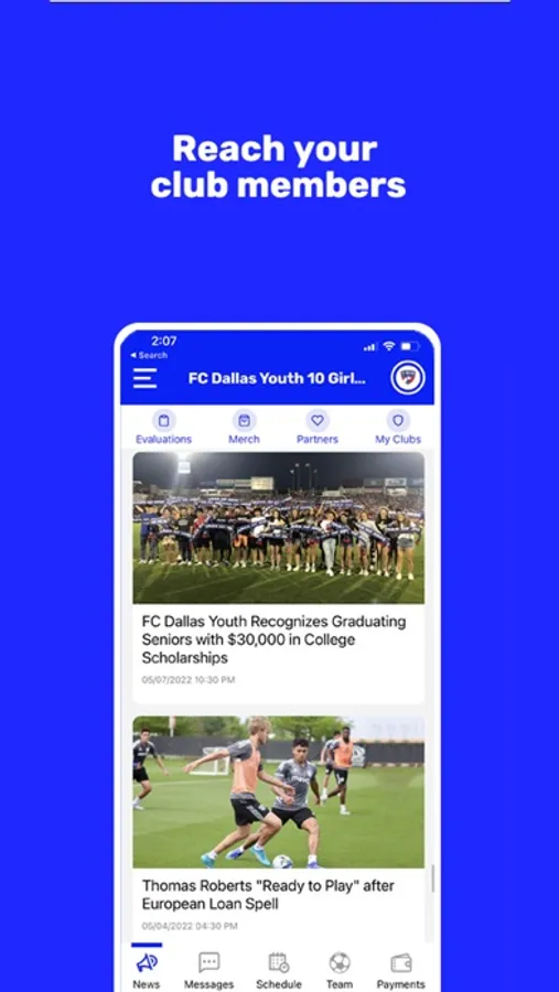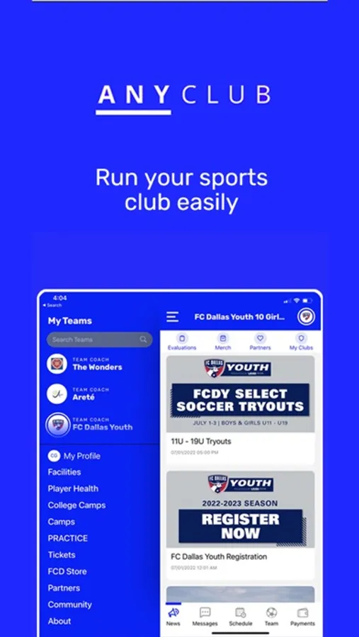 The AnyClub app is for sports teams and clubs that allows players to register, pay, get evaluated, and access all club and team-related content.