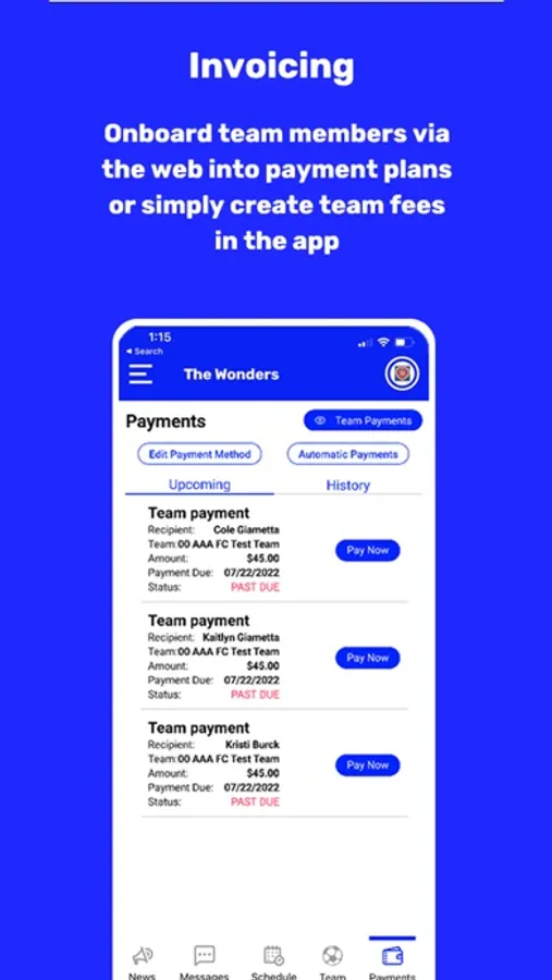 • Payment Processing: AnyClub has partnered with Stripe for secured and fast payment processing. Clubs can onboard team members by creating payment plans they can choose. Teams can invoice team members individually or as a team. All payments can be made in app or via the web based site.