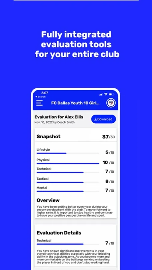 • Player Evaluations: Easily create custom evaluation templates to use for your teams. Coach and Player communication happens throughout the evaluation process. Parents can see where their players are excelling and where they need to focus.
