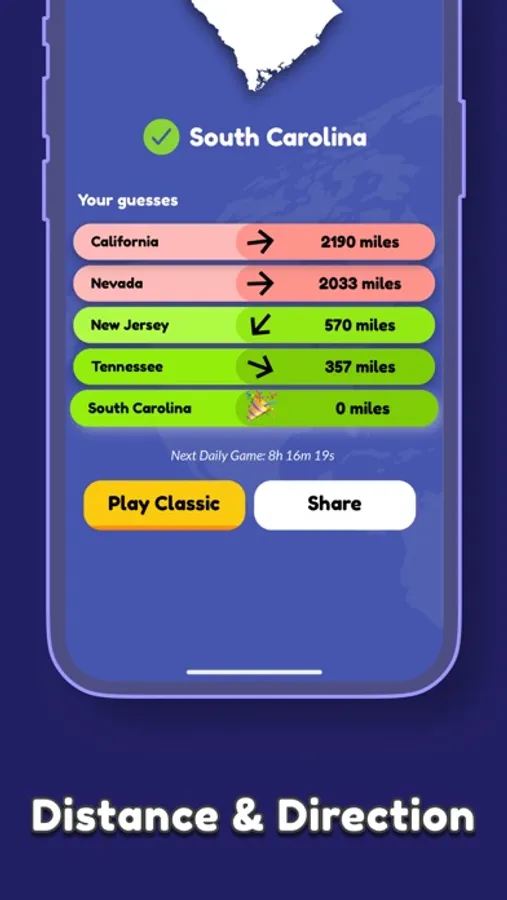Every day there is a new state to find. During the game, you will receive get a direction to go (north, south, west, east, etc.) and distance in miles after your guess.