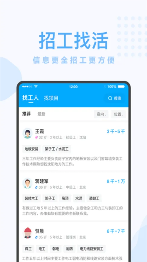 【实名认证】拒绝虚假信息,招工用工信息透明,使用更放心。为招工方和工人双方提供了双向的信用保障,确保工人的的权益,让工人放心工作,企业安全用工。