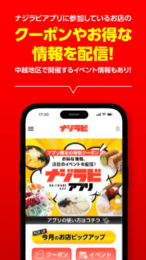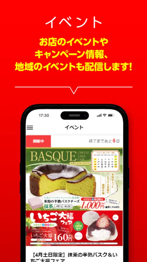 各店から配信されるイベント情報やキャンペーン情報を閲覧できます。地域で開催されるイベント情報もあります。