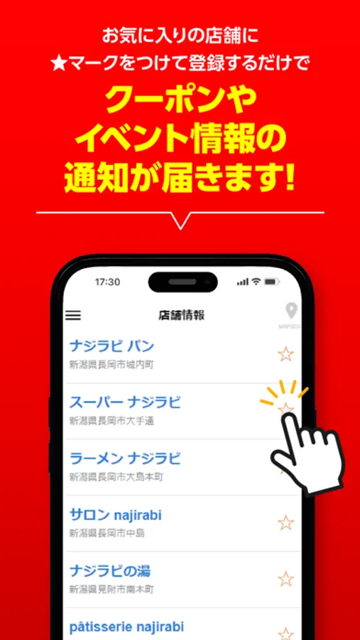 お気に入りのお店を登録しておくことで、お得な情報を優先して受信することができます。「MAP表示」を使用すると、GPS機能でお近くの店舗を見つけることができます。