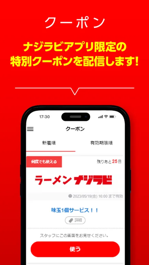 店頭ですぐ使えるお得なクーポンを各店から配信します。お気に入りに登録した方だけに配信される限定クーポンもあります。