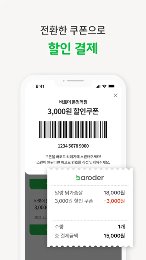 키오스크에 매장 쿠폰 바코드를 찍어 바로 할인받아요.
