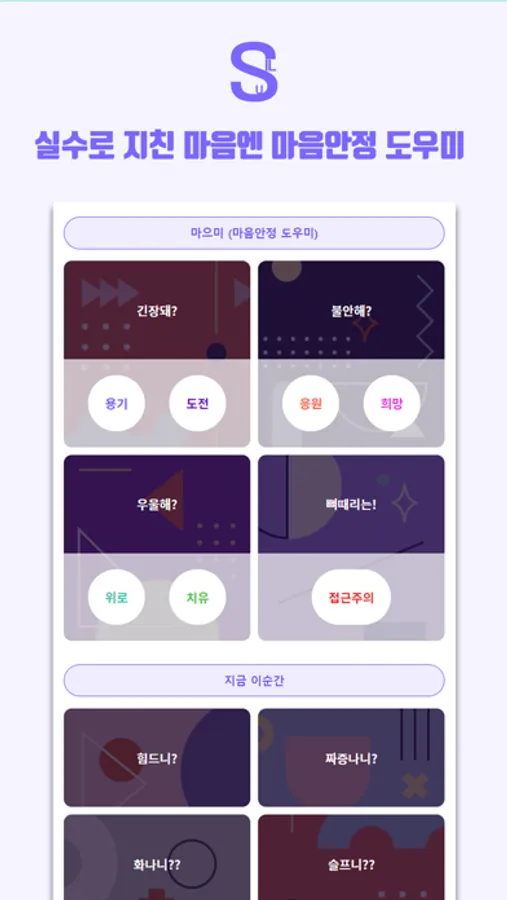 6. 실수로 지친 당신께 마음안정 도우미 및 지금 이 순간 문구 제공 기능