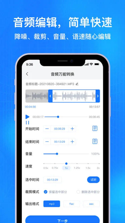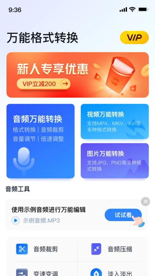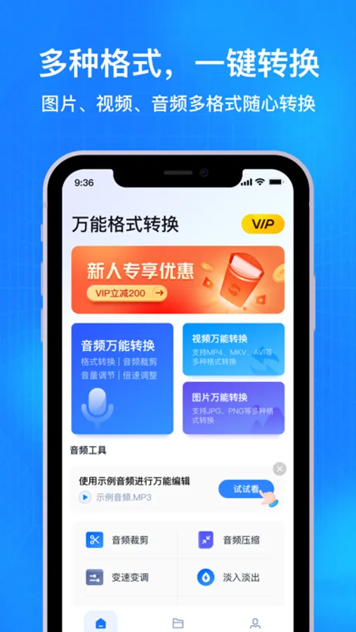 万能格式转换是一款支持音频裁剪、压缩、淡入淡出、格式转换、变速变调的专业音频处理软件。导入音频文件后即可对音频进行各种操作,最后可按照您的想法一键导出您所需要的音频格式!本app支持各种主流音频格式,操作便捷,功能强大,是您编辑音频的得力助手,同时新版本新增了视频编辑等额外功能,快来下载体验吧!