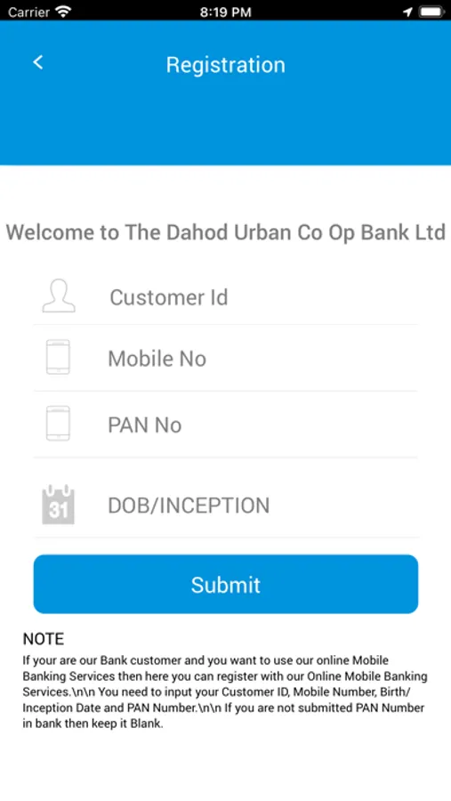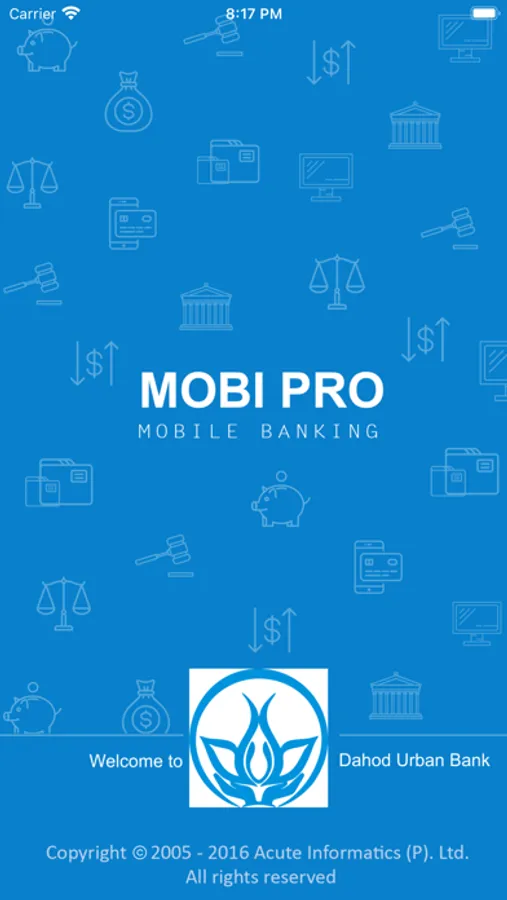 MobiPro Mobile Banking application for Apple Phone customers of Dahod Urban Bank supporting English languages.