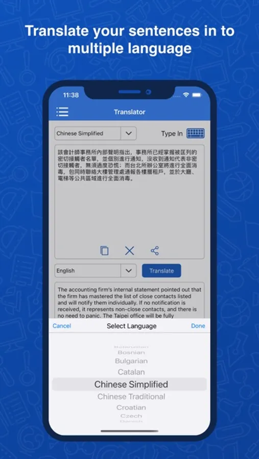 6- There is a feature in our app that you will not find in any other app is- Users can write the sentences in the selected language and translate them into the other selected language also they can copy and share the translated text with anyone.