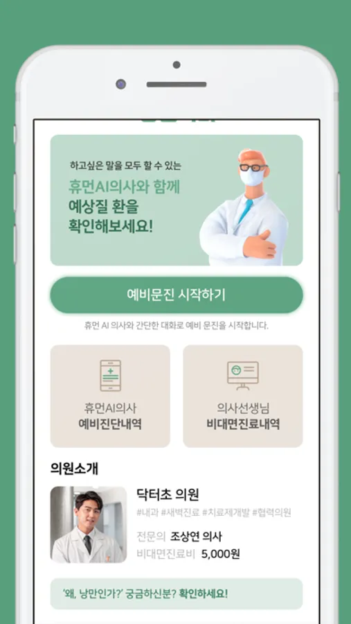 낭만 닥터 플러스 휴먼 인공지능 주치의 'AI닥터초'는 실제 의사선생님을 모델로 학습시켰고, 비대면 의료상담에서 만나게 되는 의사 선생님과 같은 얼굴이기도 합니다.