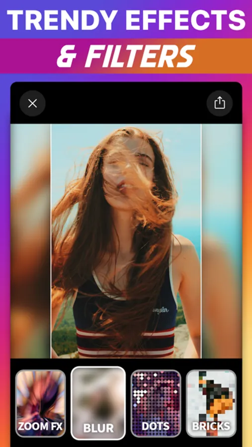 ◉ Effects: Apply blur, pixelation, dots, and other cool effects.