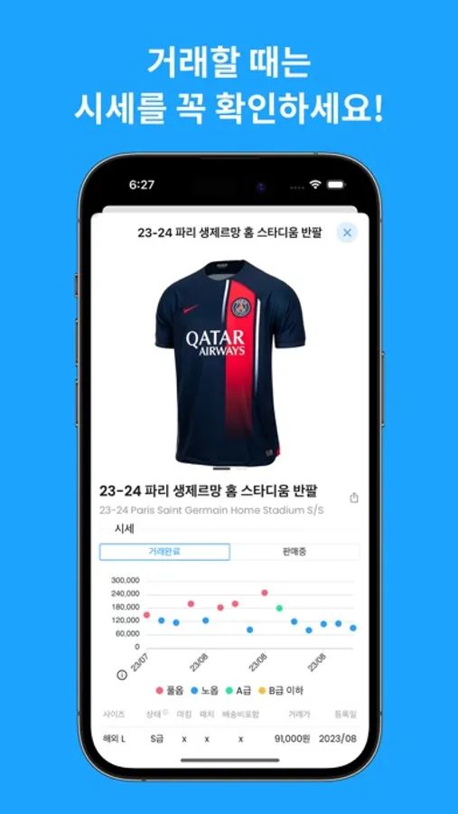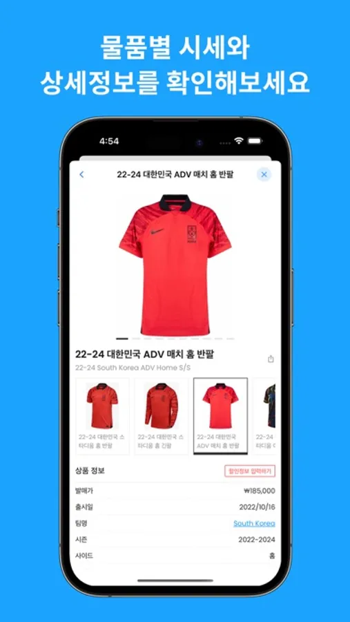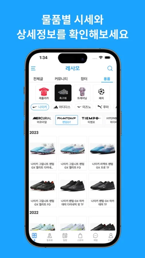 3. 축구용품 : 용품 별 상세정보와 발매가, 실측, 시세를 확인할 수 있습니다.