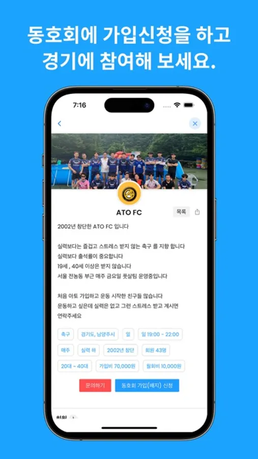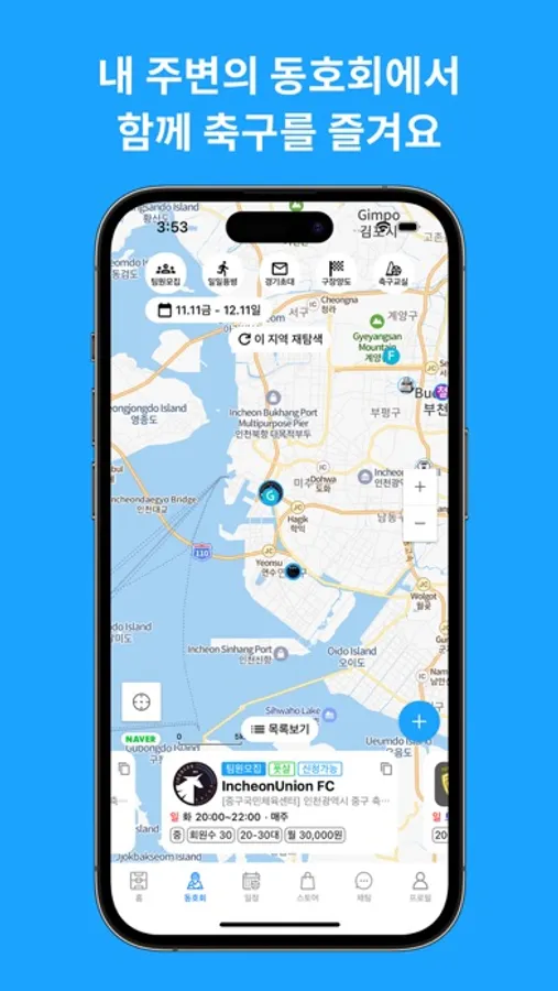 6. 동호회 : 팀원과 용병모집, 경기초청, 구장양도 등의 기능을 활용해보세요.