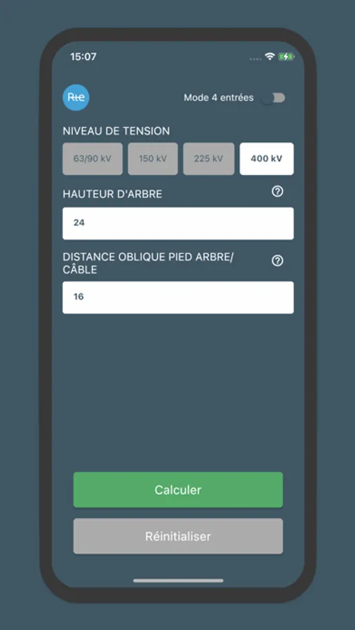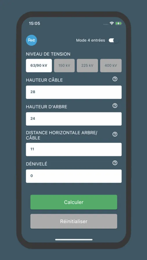 Mode 4 entrées : hauteur du câble, hauteur de l’arbre, distance horizontale entre le pied de l’arbre et le câble, et dénivelé.