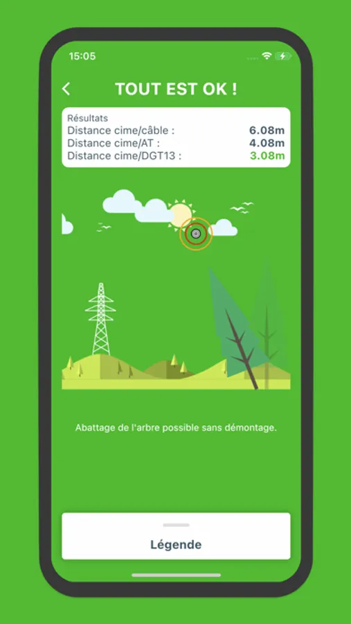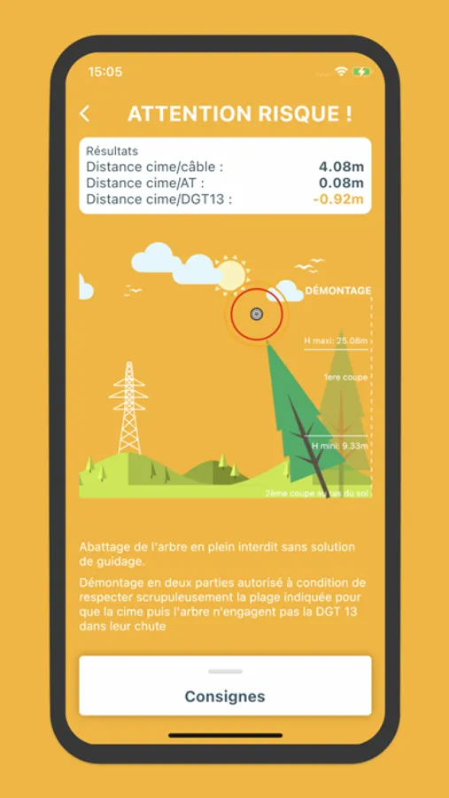 Grâce à quelques mesures précises, vous simulez la chute d’un arbre vers la ligne électrique, vous connaissez les distances d’engagement de la DGT 13 (ou de contact avec le câble électrique), et vous adaptez votre mode opératoire.