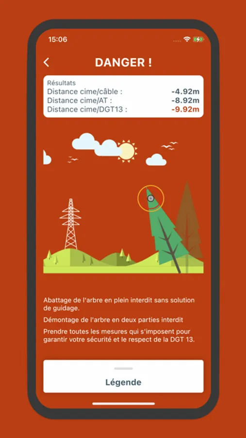 - Risque fort (couleur rouge) : la DGT 13 (a minima) est engagée : l’abattage est interdit sans solution de guidage ; le démontage en deux parties est impossible donc interdit.