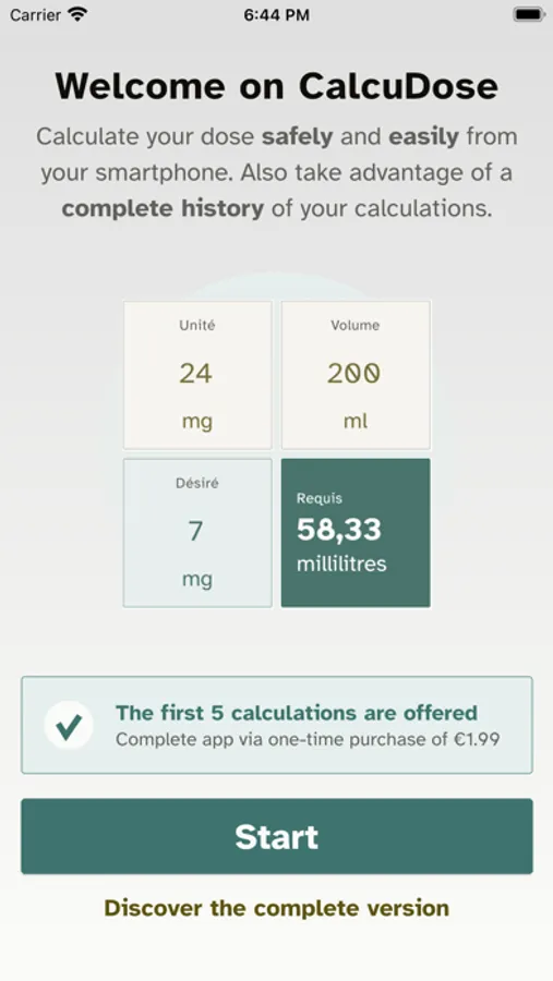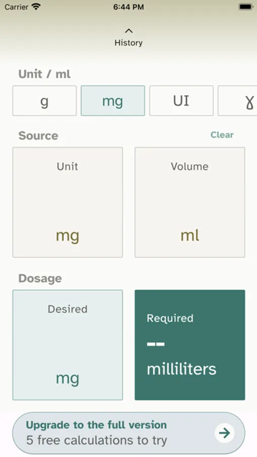 1. Select the basic unit of the concentration of your solution from those proposed (g, mg, µg or IU)
