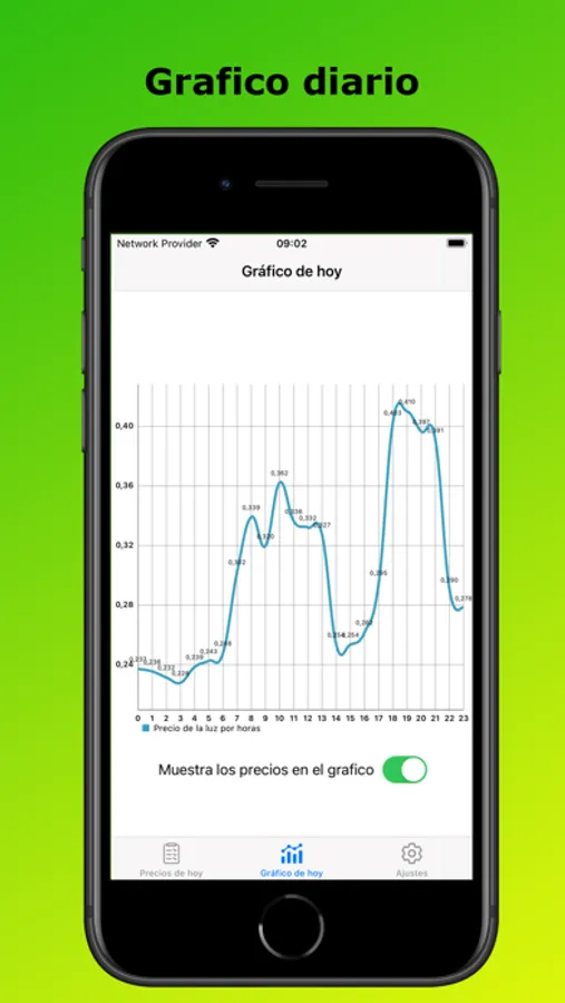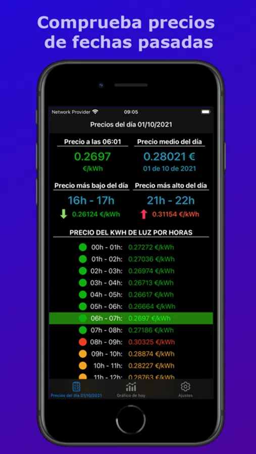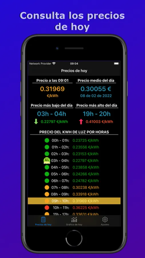 Consulta a diario los precios de la luz en €/kWh de forma sencilla y distinguiendo por horas cual son las mejores franjas horarias, cuales tienen un precio medio y cuales son las franjas horarias a evitar.