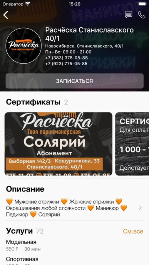 * Напрямую связаться с администратором любой из парикмахерских в чате приложения и получить консультацию онлайн