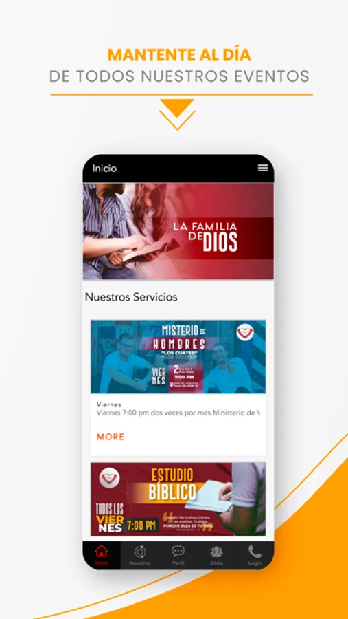 * Ver e interactuar con los eventos y ministerios.
