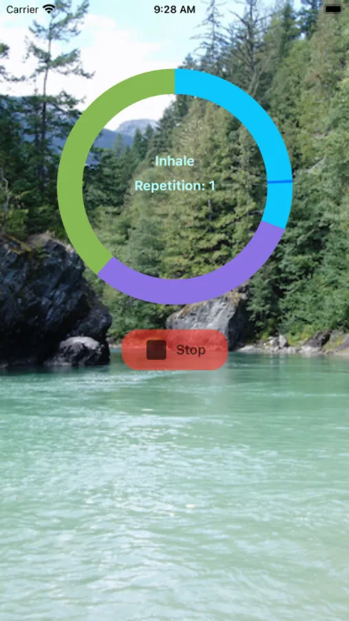 When the screen first opens, use the preset values or set your preferred time in seconds for inhalation, holding and exhalation, and how many times you wish the cycle to repeat. Version 2.0 adds an optional second hold between exhalation and inhalation. Use the volume buttons on your device to set the sound level. Once set, click the Start button and the settings buttons disappear. Simply follow the marker around the circle, or set aside your device and listen to the voice prompts guiding your breathing.