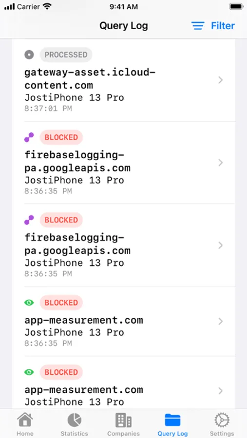 - Query Log with search and filters