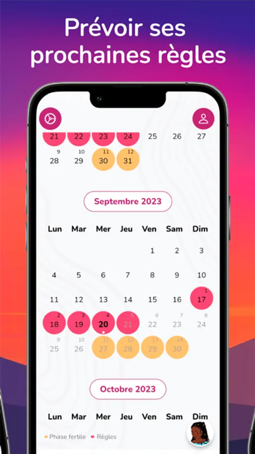 La calendrier personnalisé t’aidera aussi à identifier (en jaune) la phase dans laquelle se produit l’ovulation et où le taux de fécondité est le plus élevé.