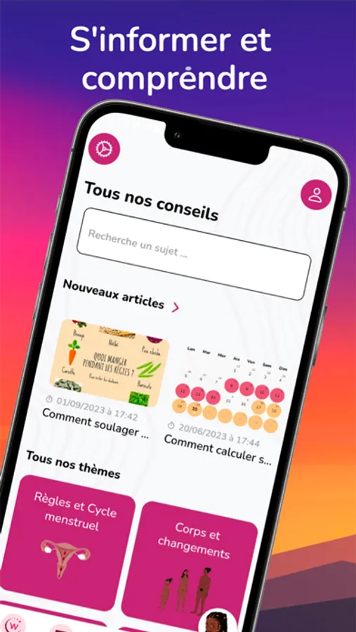 Chaque jour en ouvrant ton application, tu découvres un conseil adapté à la phase du cycle dans laquelle tu te trouves. Des astuces pratiques, des infos santé et développement personnel.