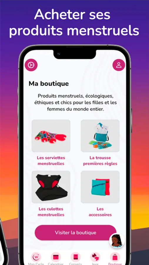 Il est également possible de se connecter à l’application sans inscription et d’avoir accès à l’onglet “Conseils” ainsi qu’à la “Boutique” en ligne. Idéal pour les jeunes filles qui n’ont pas encore leurs règles et pour les mamans et les papas qui souhaitent en savoir plus pour mieux accompagner leur fille dans la découverte et la gestion des règles.