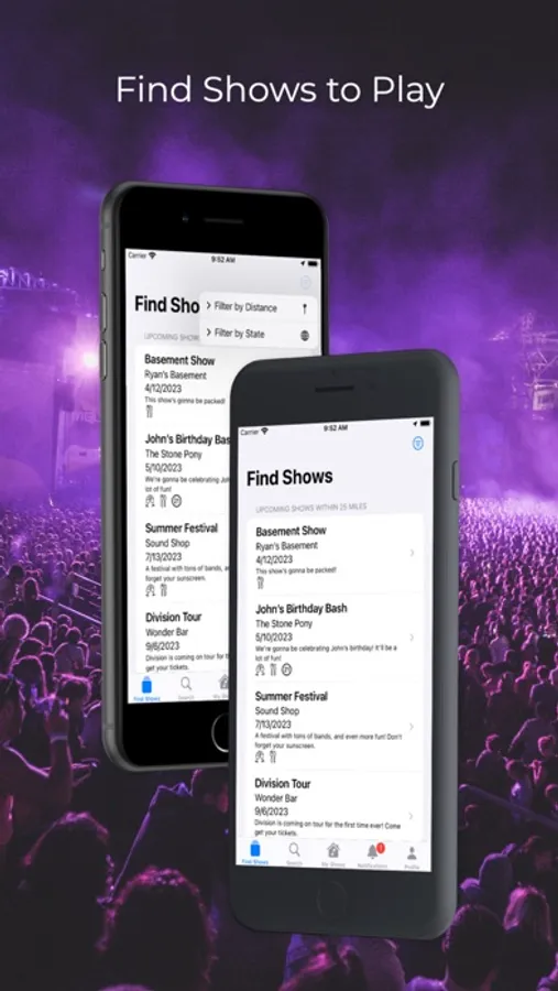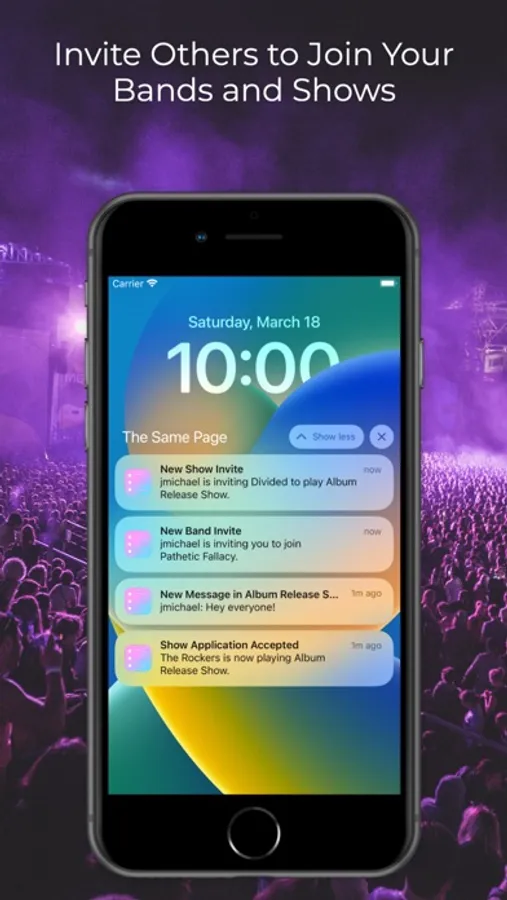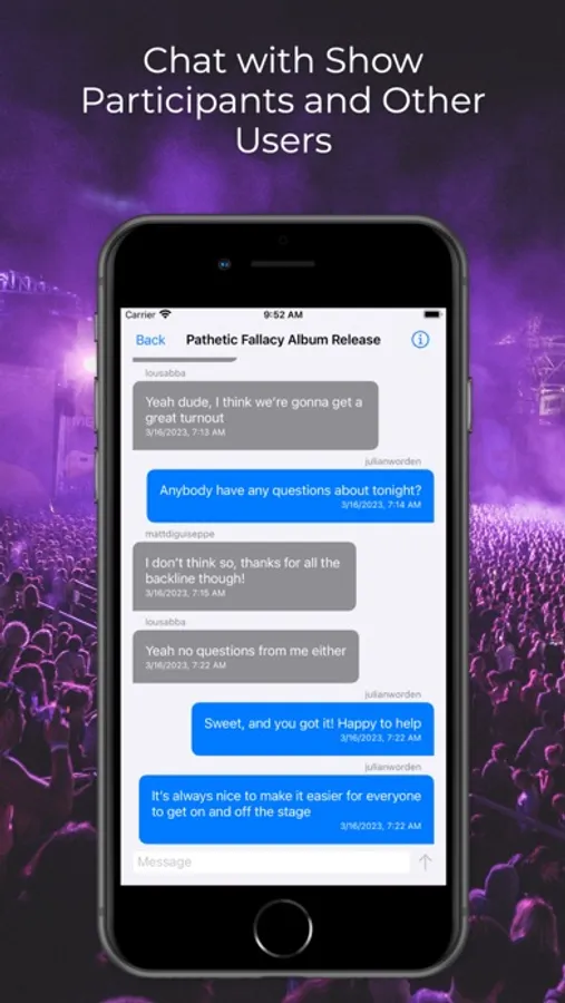 On The Same Page, every show has a group chat, so there's no longer a need to hunt down contact info for someone new. Each show also has backline, time, and location information. A show's location can even be private, making The Same Page perfect for anyone booking house shows.