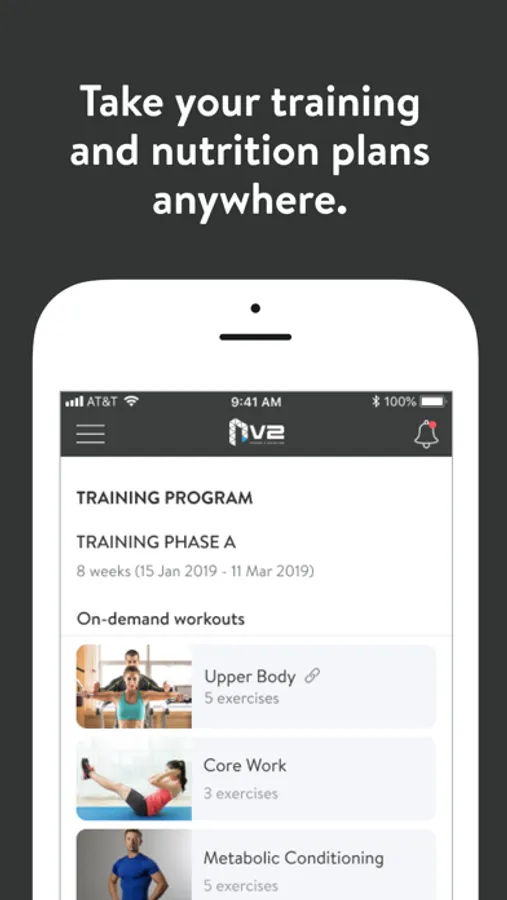 With the NV2 Fitness App, you can start tracking your workouts and meals, measuring results, and achieving your fitness goals, all with the help of your personal trainer.