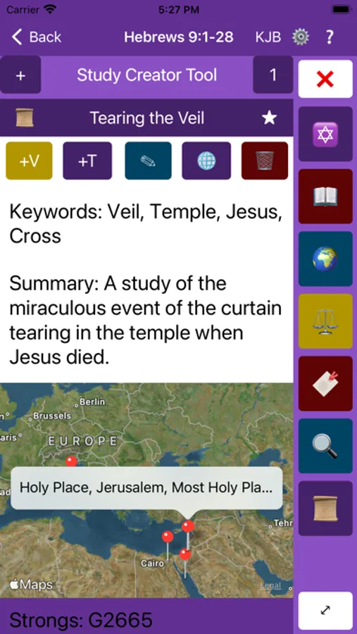 Veil's Study Creator Tool makes it easy to preserve your discoveries beautifully Share your crafted studies with the World via the Veil Study Library in development. Add custom Maps, Strong's words, custom text, Bible verses, and more to your Bible Studies and prepare for the release of the Veil Study Library in the near future.