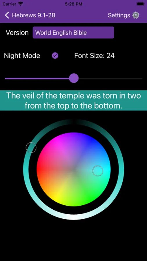 Tap the Settings Wheel to turn Night Mode ON or OFF, change the Scripture Version, adjust your Font Size and even customize your Verse Highlight Color!