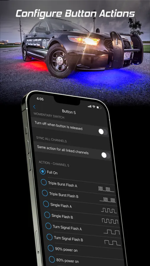 - 8 customizable buttons: 20-100% solid on, various strobe and flash patterns.