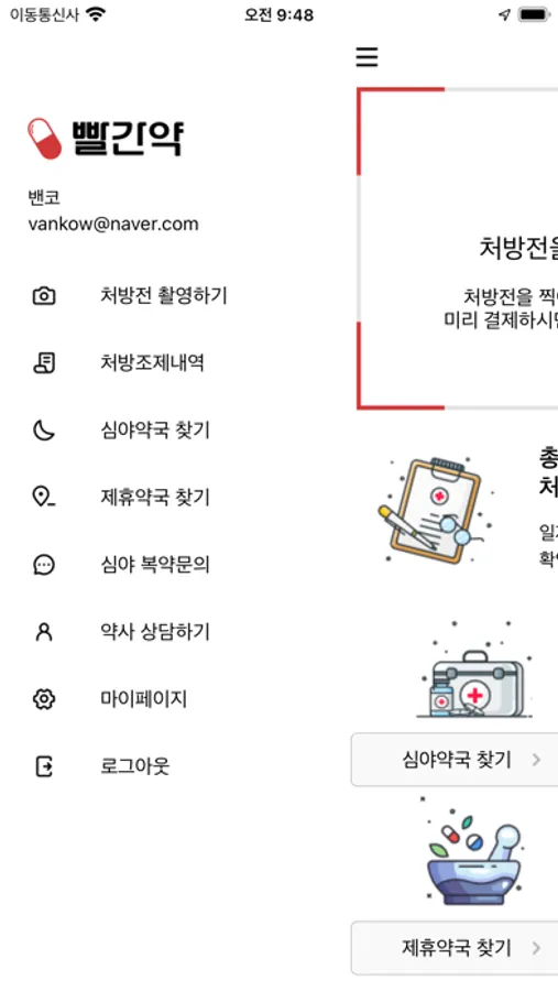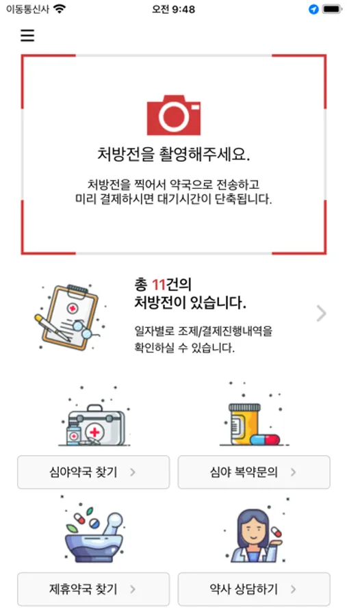 - 스마트폰으로 처방을 찍으면 처방조제 가능한 주변 약국을 자동으로 표시하며 선택약국으로 처방전을 전송할 수 있습니다.