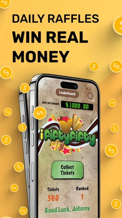 Unlike other money games, iFiftyFifty is completely free to play. You can win real money without having to spend a dime. Just spin the wheel, collect tickets, and wait for the daily raffle drawings. It's that easy!