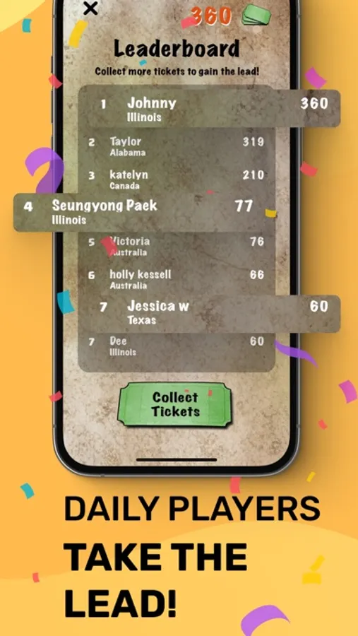 Spin the wheel to collect tickets! The more tickets you have, the better your chances of winning real money in our daily raffle drawings. No purchase necessary, so download today and start winning!