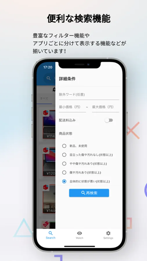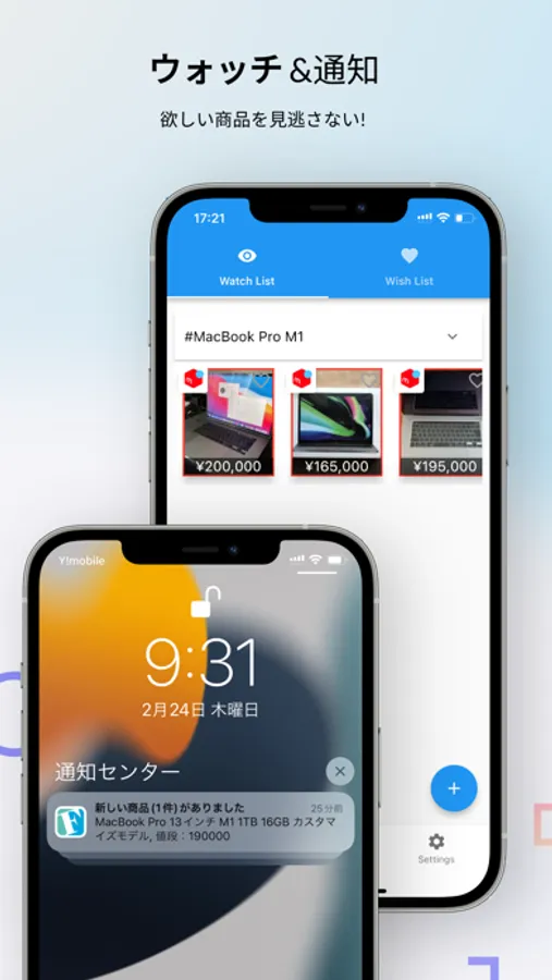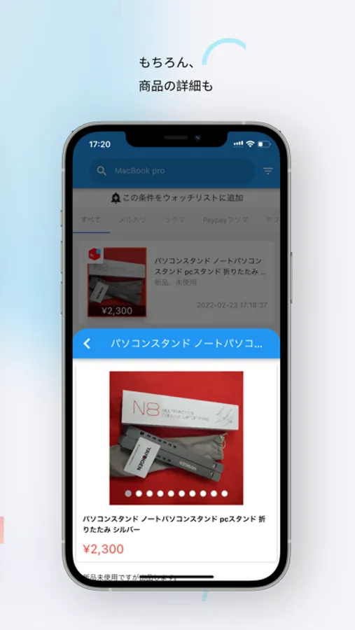 商品のキーワードや価格を設定し、条件に合致する商品が出品されると、リアルタイムでアラート通知が届きます。
